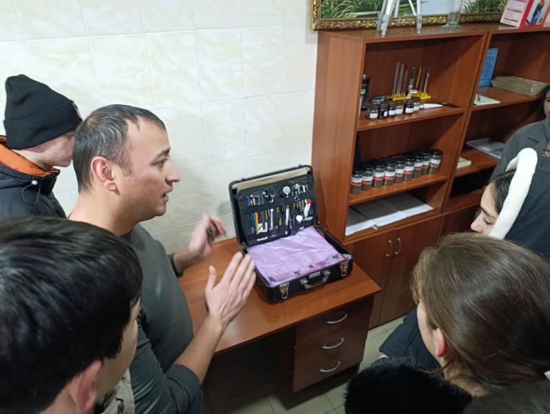 Продолжилась встреча знакомством подростков с работой экспертно-криминалистической службы. Эксперт-криминалист познакомил молодежь со своей работой, рассказал, как обнаруживаются и изымаются улики с места происшествия, как правильно фиксируются и изучаются следы.Полицейский наглядно показал ребятам, как с помощью специальных приспособлений из его чемодана, с которым он выезжает на места происшествий, обнаружить и зафиксировать следы пальцев рук.