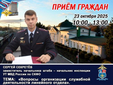 23 октября 2025 года с 10:00 до 13: 00 в административном здании в приемной Нальчикского ЛО МВД России на транспорте (г. Нальчик) по адресу: г. Нальчик, ул. Осетинская, 132А состоится личный прием граждан заместителем начальника штаба – начальник...
