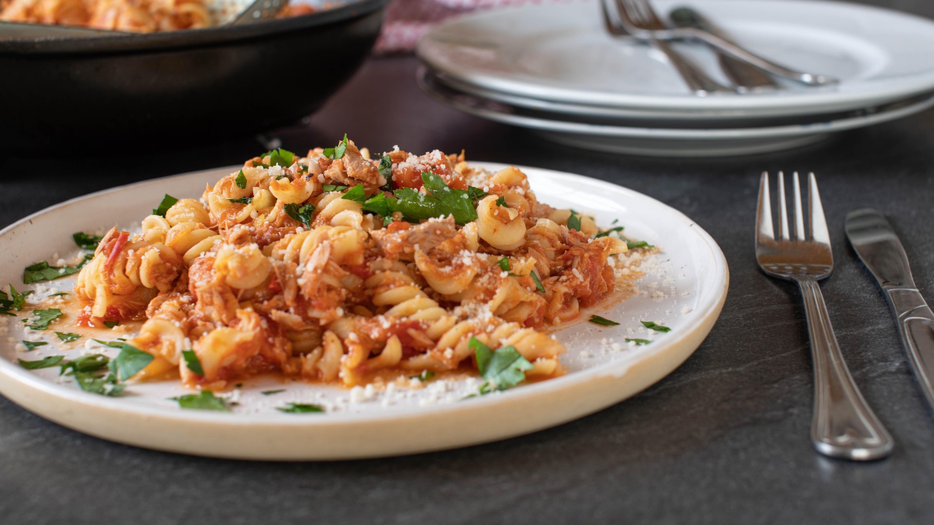Макароны поставьте вариться. За это время измельченный лук обжарьте до золотистой корочки. С помидора снимите кожицу, мелко его нарежьте и вместе с горошком и тунцом выложите к луку. Подержите на огне 5 минут, затем добавьте специи.