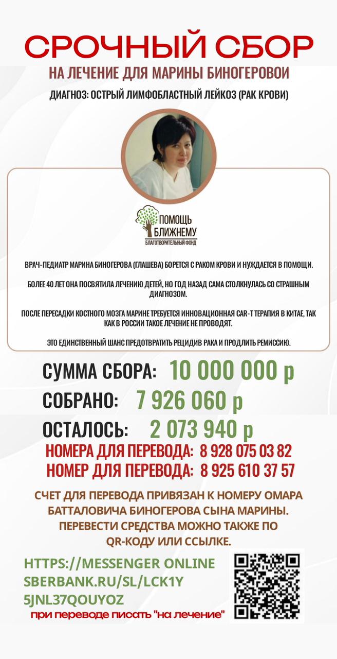 Жительница Кабардино-Балкарии борется с раком крови и нуждается в нашей помощи. Врач-педиатр Марина Биногерова, более 40 лет посвятила лечению детей, но сама столкнулась со страшным диагнозом – острый лимфобластный лейкоз.
