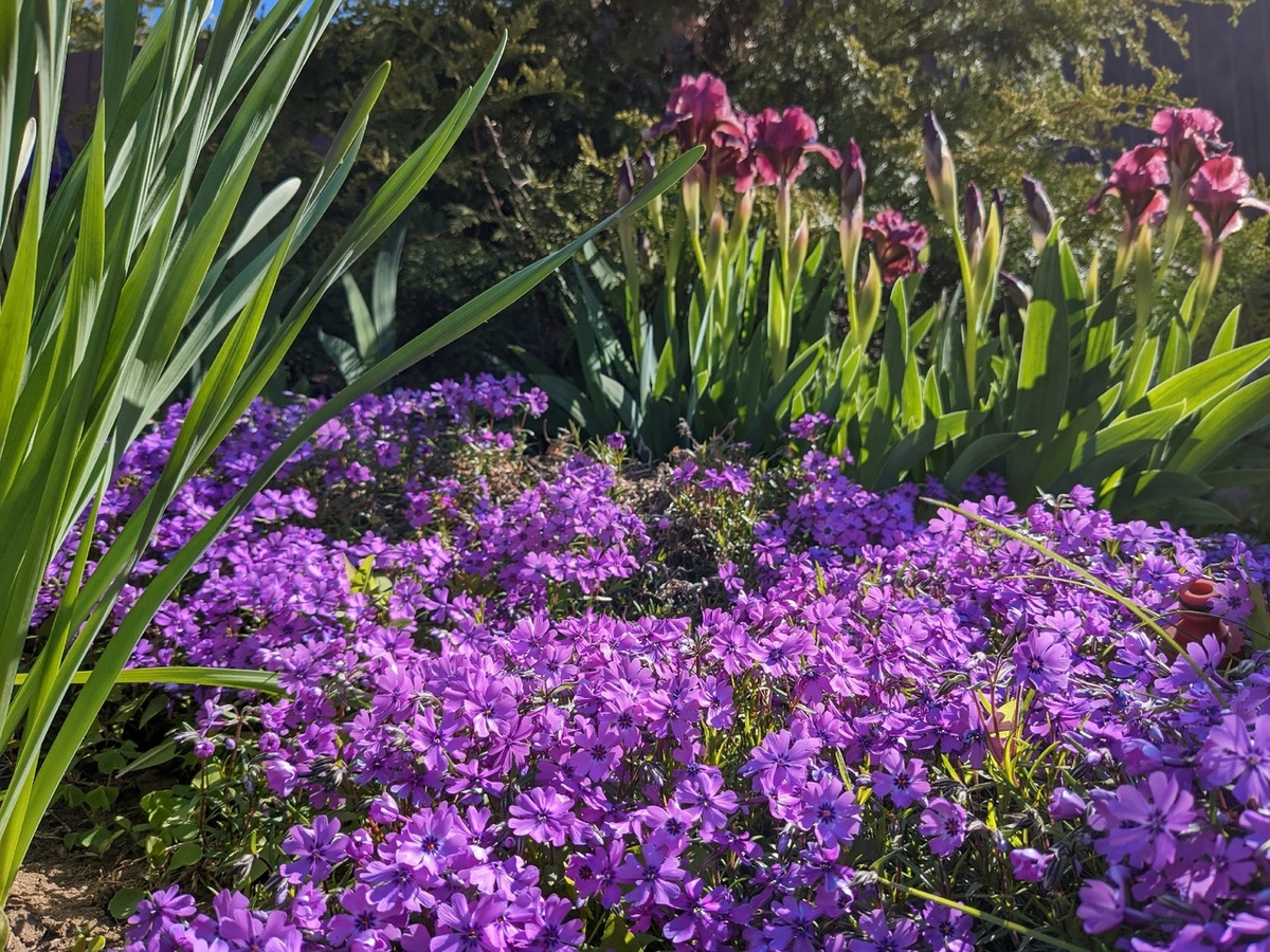 Шиловидный флокс прекрасно справляется с задачей почвопокровного растения, стремясь покрыть площадь своим зелёным ковром. В то время как карликовый ирис, благодаря своей вертикальной форме, словно выделяется на фоне этого травяного океана. Такое сочетание вызывает интерес благодаря контрасту форм и текстур, создавая атмосферу живого цветника.