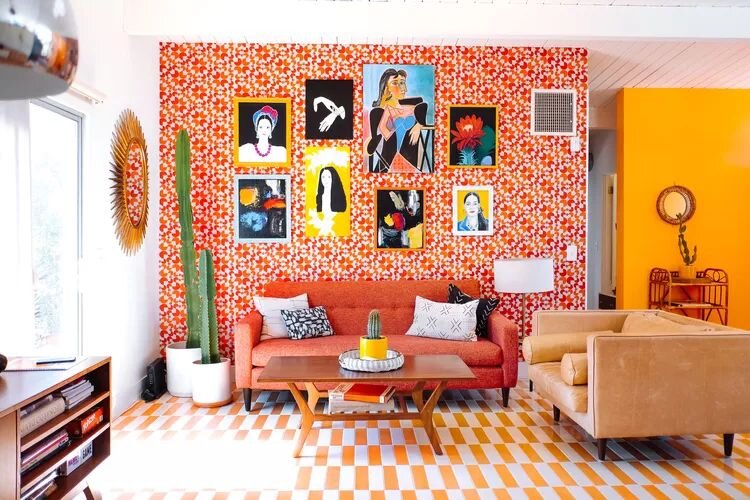 Яркие цвета и броские узоры — это то, что помогло выделить 70-е из серой массы. Использование смелых комбинаций оттенков способно преобразить любое пространство. Рассмотрите возможность смешивания различных паттернов от пола до потолка, чтобы создать эффектный интерьер. Либо можно использовать обои с яркими принтами, которые вернут вас в атмосферу оптимизма тех времен.