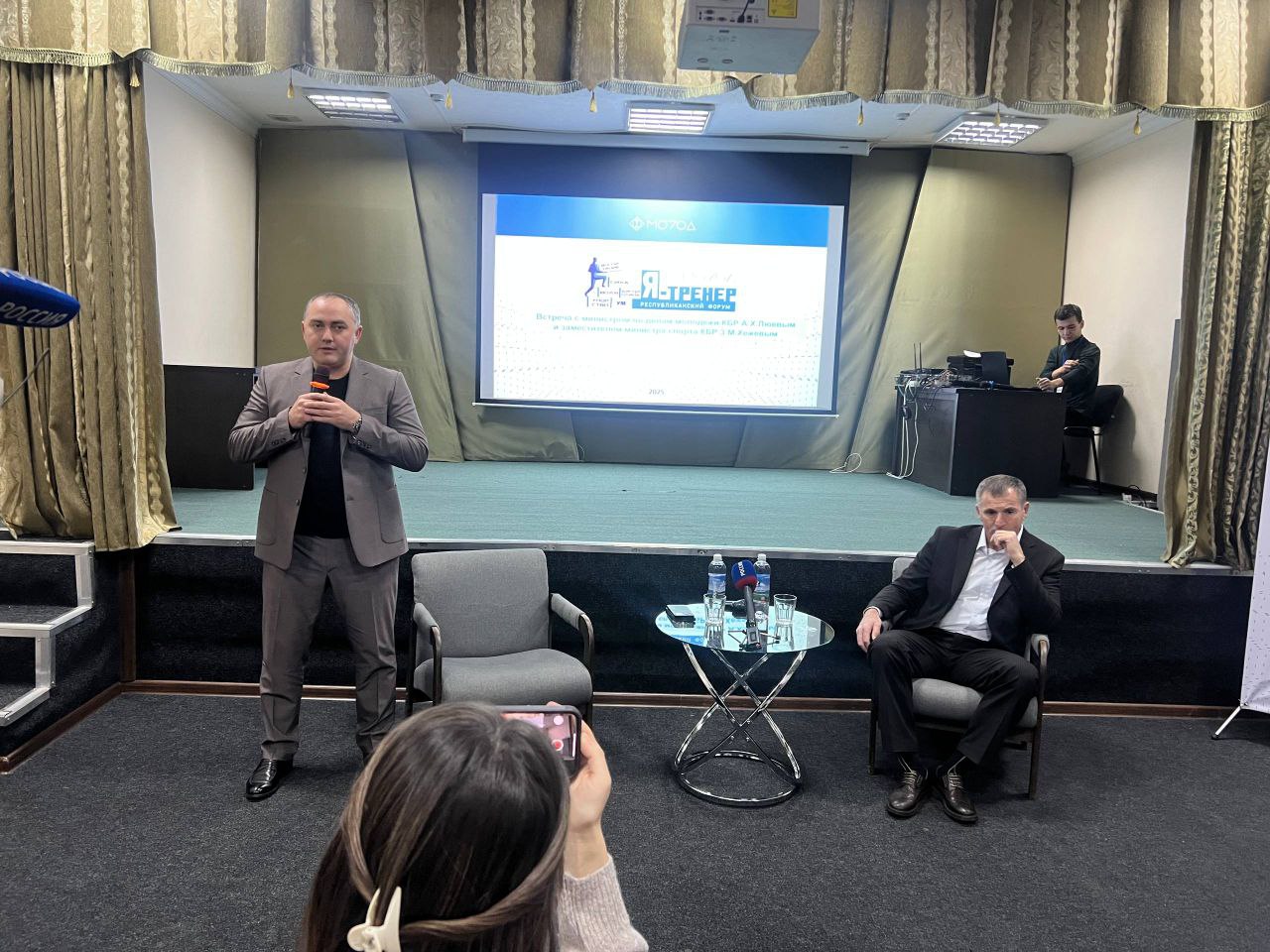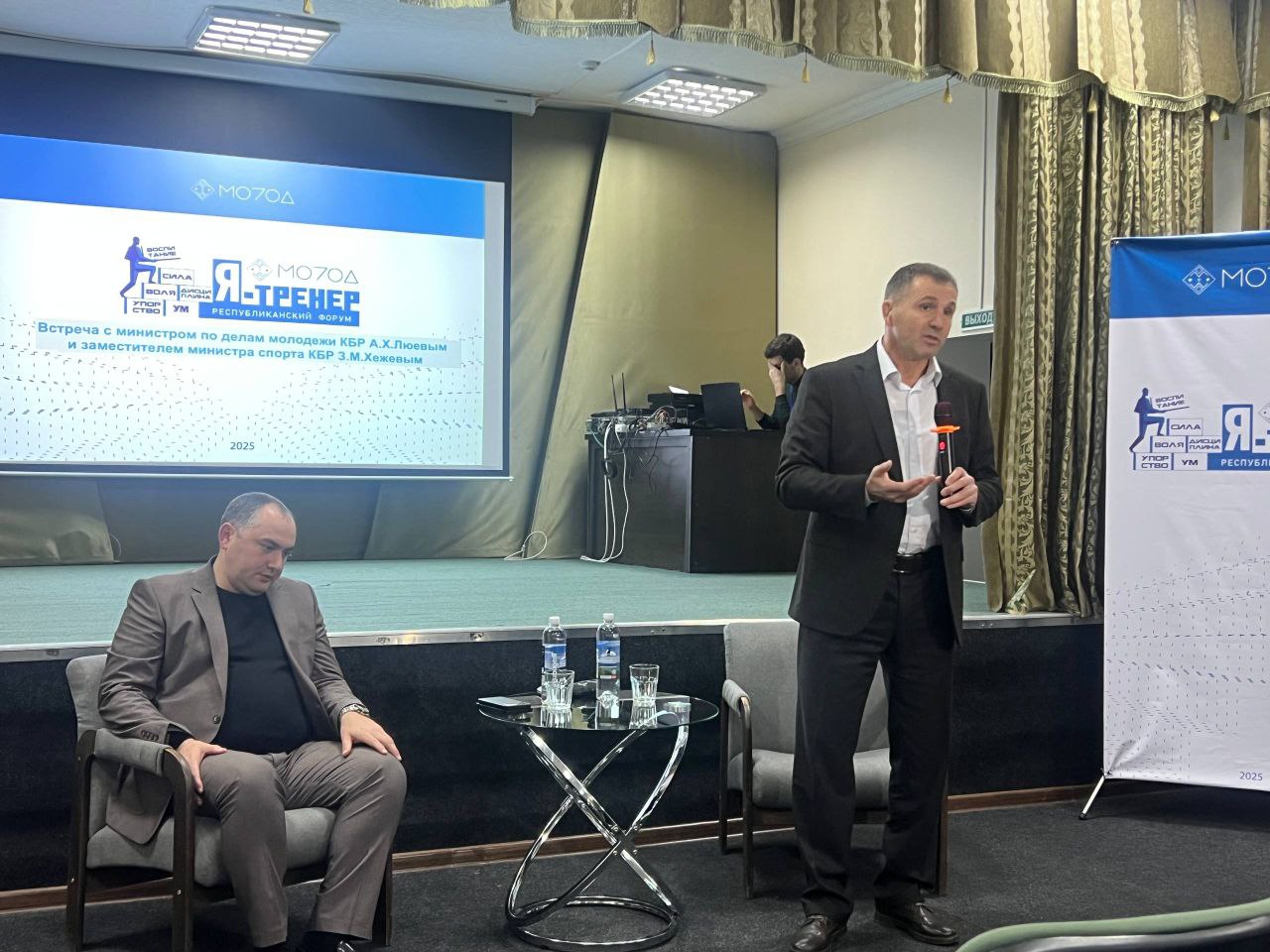 2-й республиканский форум спортивных наставников «Я тренер» проходит в Приэльбрусье. В первый день в гости к участникам приехали министр по делам молодежи КБР Азамат Люев и замминистра спорта КБР Заур Хежев.
