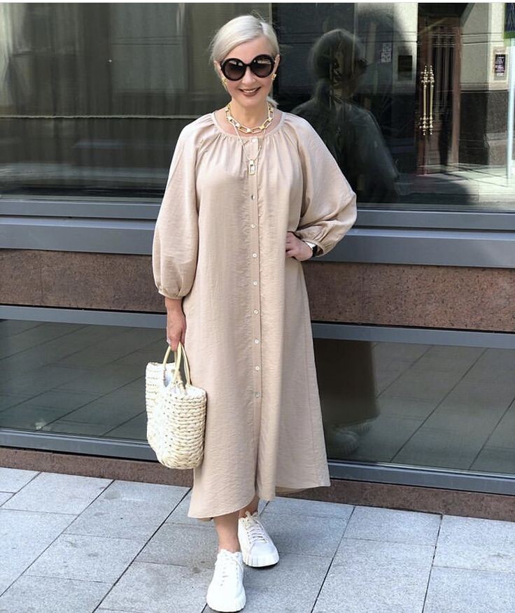 1. Платье-рубашка из легкого льна: Это романтичная модель с пышными рукавами и широким подолом станет отличным выбором для летних дней. Сочетание с белыми кроссовками придаст образу свежесть и удобство для повседневной носки.