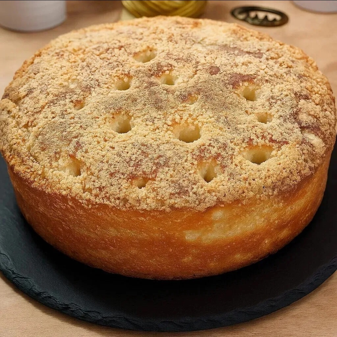После этого подготовьте форму для выпечки, застелив дно пергаментом и смазав маслом. Переложите в неё подошедшее тесто, сделайте углубления и равномерно распределите охлаждённую посыпку. Выпекайте при температуре 180°C в течение 25 минут, затем полейте пирог сливками и верните в духовку еще на 10 минут. По окончании выпечки дайте ему немного остыть перед тем, как снять с формы.