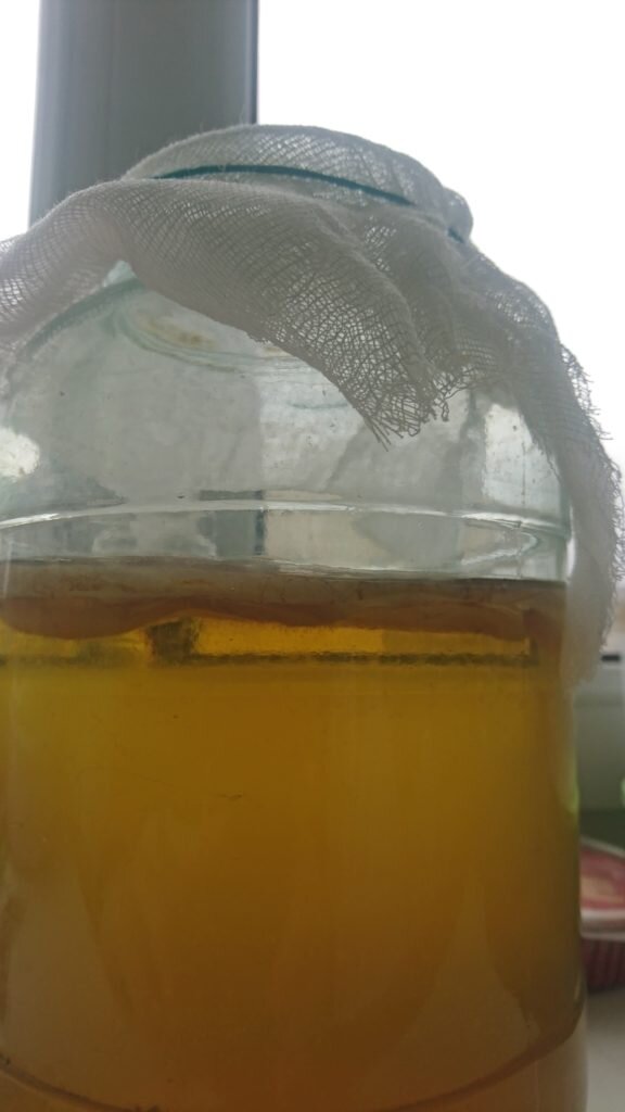 - Процеженную жидкость вылейте в 3-литровую банку и добавьте заварку черного чая (на 1 литр воды — 4 чайные ложки чая) с растворенным сахаром (8 столовых ложек).