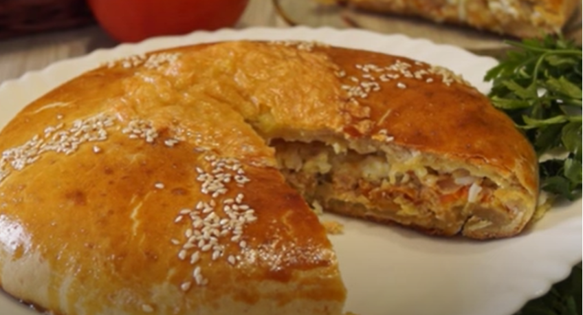 Тесто разделить на две части: одну побольше, другую поменьше. Меньшую часть раскатать в круглый пласт и уложить в форму. Выложить начинку, посыпать тертыми яйцом и сыром, затем накрыть второй частью теста, тщательно подогнув края. Смазать яйцом, посыпать кунжутом и выпекать в духовке при температуре 180 градусов около 30 минут.