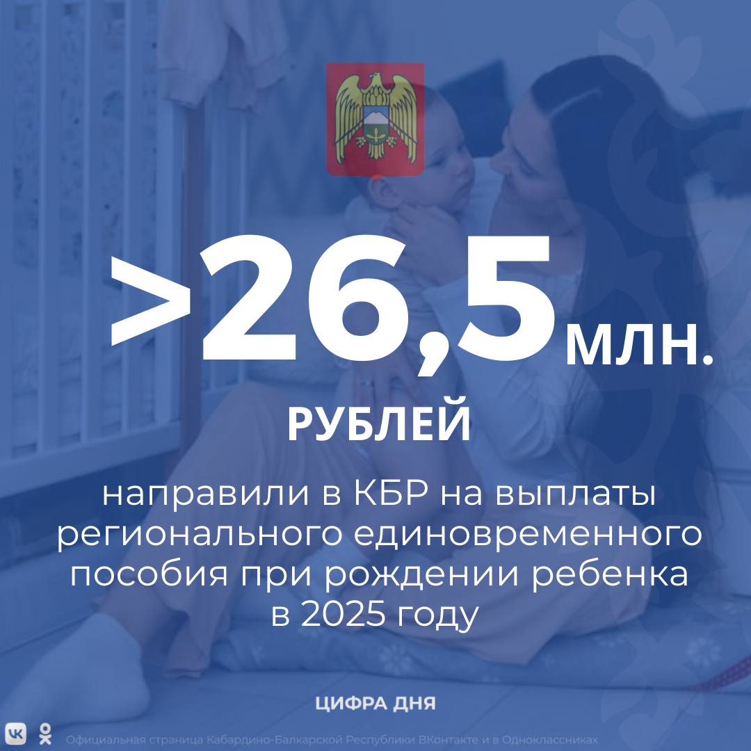Региональное единовременное пособие предоставляется при рождении ребенка. В 2025 году его получили порядка 6253 семьи Кабардино-Балкарии. Общая сумма выплат составила более 26,5 млн рублей.