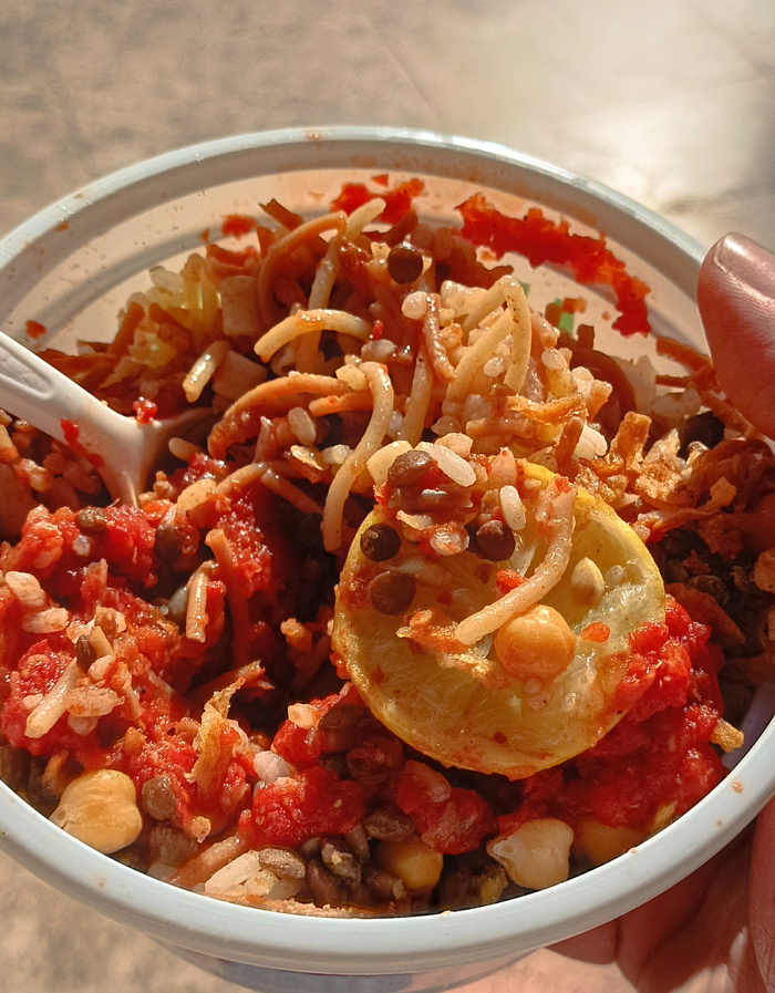 Кошари — это традиционное египетское блюдо, сделанное из риса, макарон и чечевицы, щедро приправляемое томатно-уксусным соусом. Часто в него добавляют короткие кусочки спагетти, нут и обжаренный до золотистой корочки репчатый лук. Это отличный пример сочетания простоты и насыщенности.