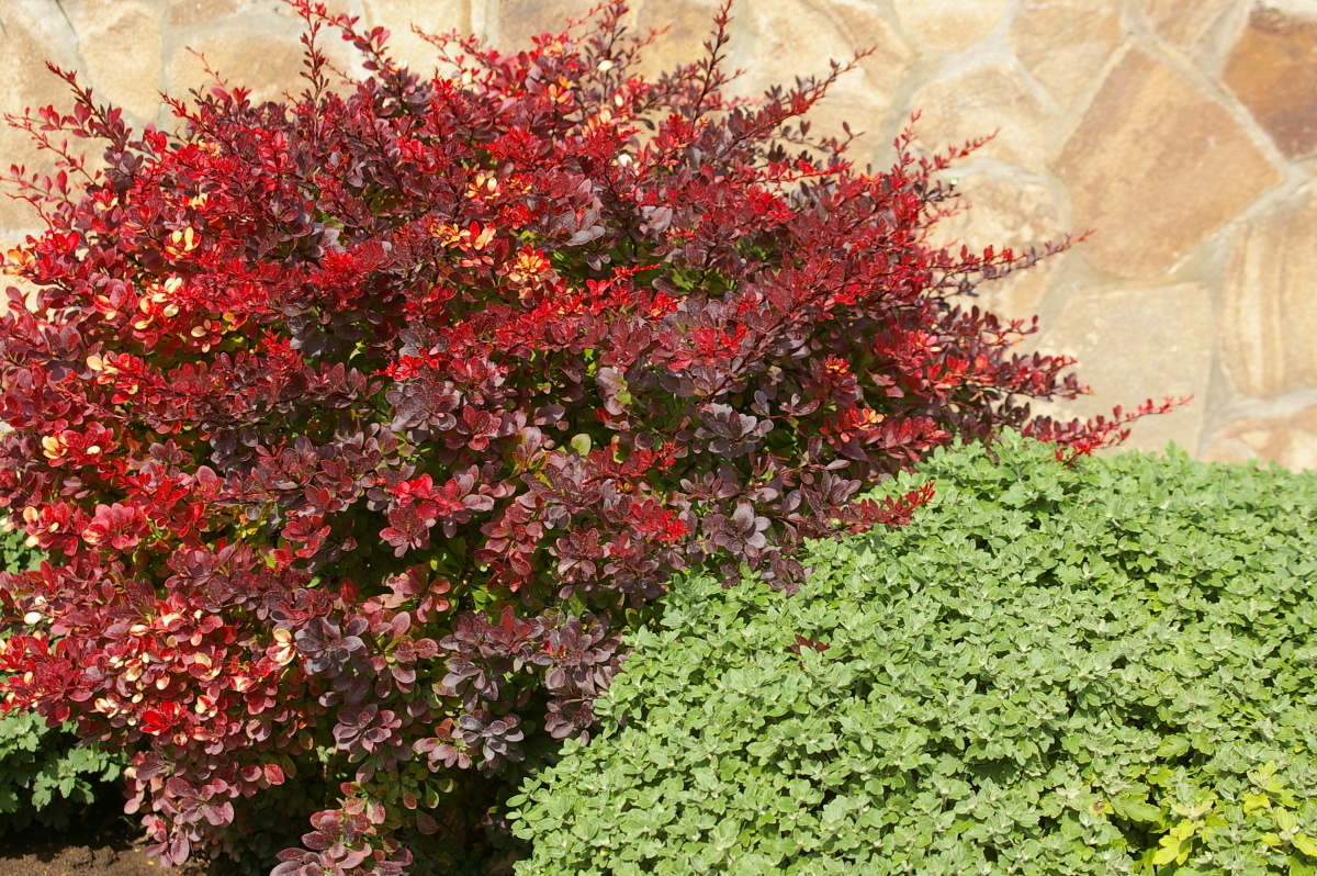 Кроме барбарисов, простор для творчества открывают такие кустарники, как пузыреплодник калинолистный и скумпия кожевенная, которые завершат контрастную композицию листьев разных цветовых оттенков.