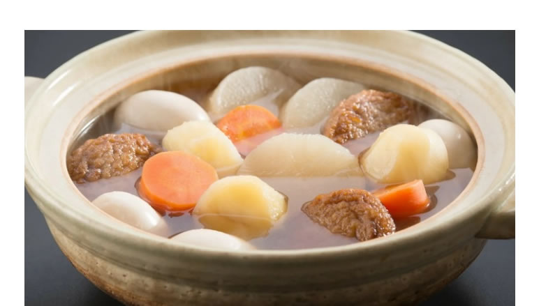 Базовая основа — бульон даси, где дары моря и сухие пары сосуществует с лёгкой сладостью и глубиной вкуса. В этот бульон уходят слегка солёные акценты, чтобы главный акцент оставался на том, что в корзине ингредиентов каждый нашёл своё место: дайкон, картофель, морковь и сацума-агэ добавляют текстуру и характер, яйца — мягкость, а приправы завершают общий настрой.