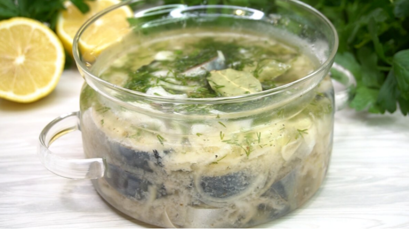 Подготовка: отрезать голову и хвост, выпотрошить, порезать на порционные куски. В миске смешать соль и сахар. В другой ёмкости соединить воду, уксус, масло и перец. В подходящей посуде — стеклянной банке или контейнере — выкладывать слоями рыбу, посыпая каждый слой смесью соли и сахара и луком. Сверху добавить рубленый укроп и лавровый лист, залить маринадом и убрать в холодильник. Через 5 часов можно пробовать, оптимально — подержать ночь: вкус раскрывается глубже.