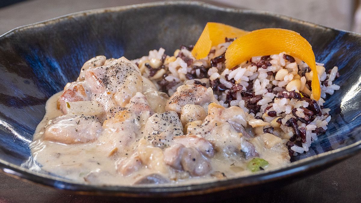 Вкусовой фон становится ярче за счёт пряностей, небольшого количества лимона и горчицы. Всё подается на смеси двух видов риса, который приобретает особую структуру благодаря чесноку и арахису, обжаренным на сливочном масле. Легкая свежесть морковных лент завершает вечернюю атмосферу.