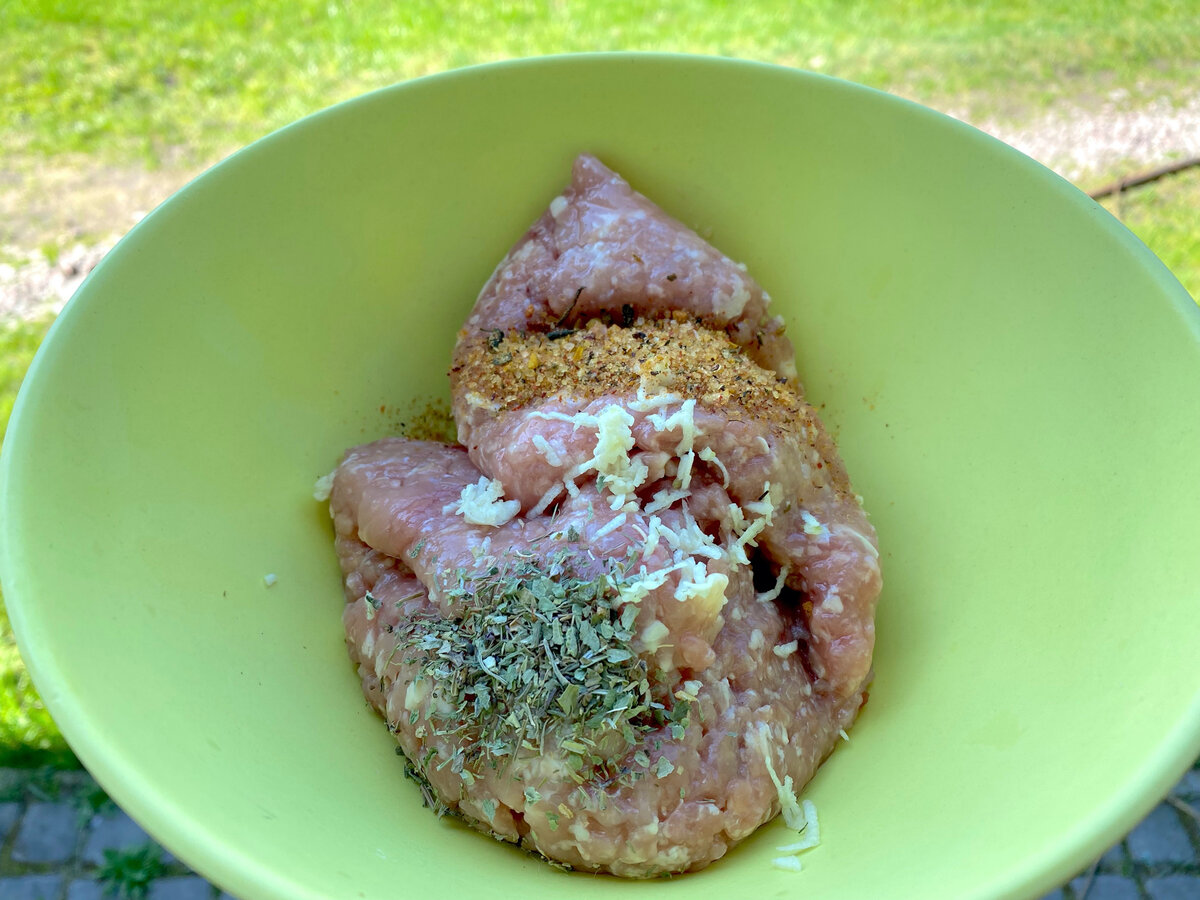 - К полученному фаршу добавить любимые специи. В этот раз хорошими помощниками в аромате стали тертый чеснок, сушеная петрушка, адыгейская соль и щепотка перца.