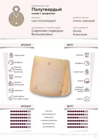 - Полутвердый козий сыр с трюфелем, Сафоново подворье Большаковых: Идеальный выбор для тех, кто обожает трюфели. Уникально сбалансированный вкус сыра с нотками горечи оставляет превосходное впечатление.