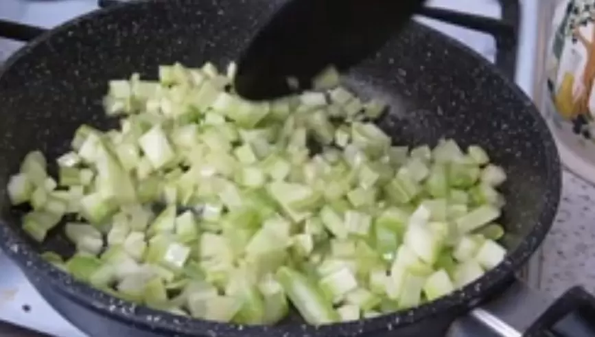 Для начала следует нарезать свежий кабачок на маленькие кубики и отправить их на сковороду. Обжаривайте овощи до золотистого цвета, чтобы они стали мягкими и ароматными.