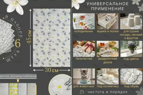 Упавшее содержимое легко очистить — достаточно вынуть коврик и промыть его под водой. Такие унифицированные коврики не только помогут в холодильнике, но и на кухне. Их можно использовать на дне раковины, чтобы защитить фарфор от повреждений, или даже как подставку для горячих кастрюль на столе.