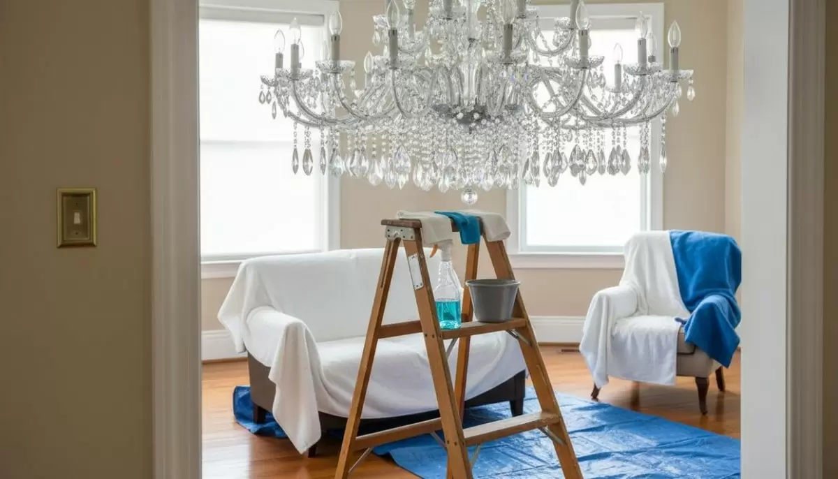 Используйте надёжную лестницу, чтобы снизить риск случайных движений во время работы. Наденьте хлопчатобумажные перчатки, чтобы избежать следов на кристаллах. Подготовьте контейнер с раствором, мягкие салфетки и дополнительную ткань для полировки.