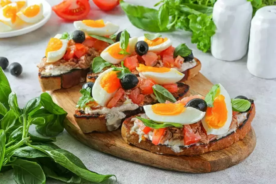 Готовые тосты украшены специальным майонезным соусом, а затем сверху выкладываются тунец и смесь из помидоров с луком. Для презентации яйца нарезаются на части и посыпаются солью и перцем. Завершающим аккордом станут веточки зелени и маслины, а также лёгкая струйка оливкового масла для финального штриха.