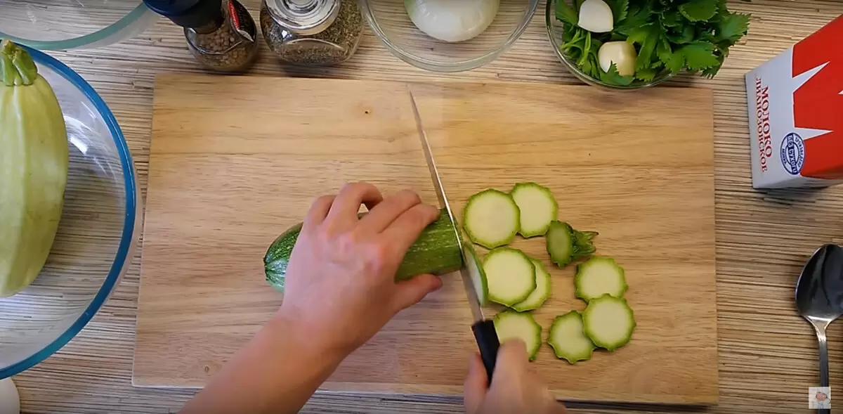 Начнем с подготовки кабачков. Их необходимо нарезать кольцами толщиной 2-3 мм и заполнять форму нависающими по спирали слоями. При использовании молодых кабачков, нарезку можно делать вместе с кожурой для сохранения всех полезных веществ.
