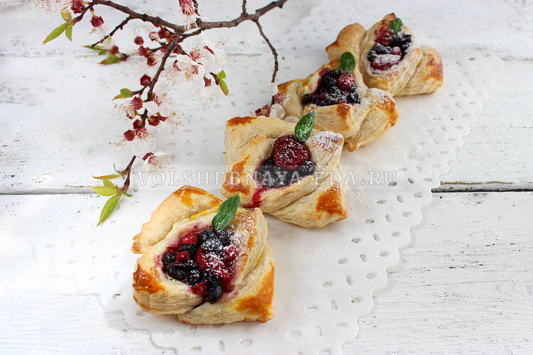 После этого заготовки помещаются на противень, покрытый пергаментом, и в них делают проколы с помощью вилки, чтобы дно не поднималось из-за сока. Внутрь каждого цветка выкладывают подготовленную начинку и смазывают края яичным желтком для лучшего подрумянивания. Слойки помещаются в духовку и запекаются в течение 25 минут до красивой золотистой корочки, а по готовности посыпаются сахарной пудрой. Такие лакомства можно подавать как в теплом, так и в холодном виде, вызывая улыбки и радость у всех без исключения.
