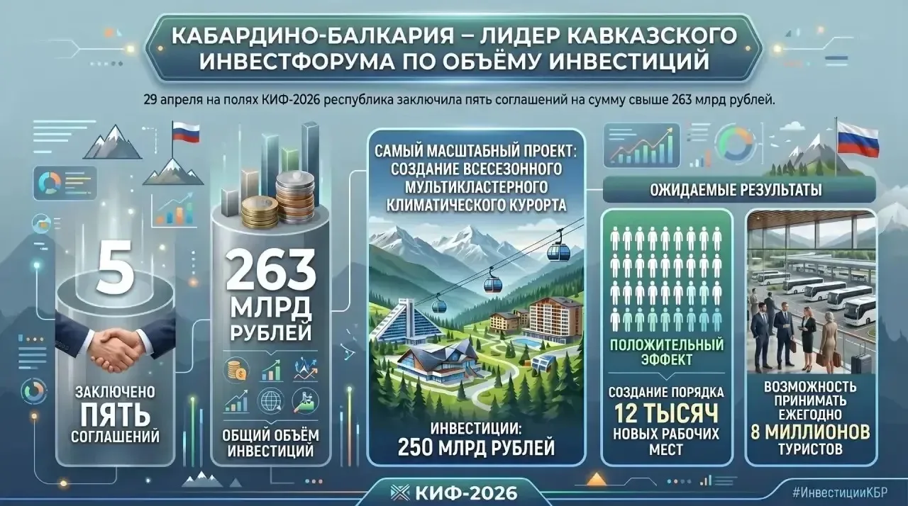 Председатель Правительства России Михаил Мишустин в рамках КИФ-2026 назвал рост инвестиций в СКФО до 1,5 трлн рублей доказательством укрепления позиций Северного Кавказа. Лидером по количеству проектов традиционно стало Ставрополье. А вот второе место заняла Кабардино-Балкария с инвестпорфелем более чем на 466 млрд рублей. Помимо развития туристического Приэльбрусья, акцент нынешнего форума – на создании всесезонного курорта Нальчик. 29 апреля на полях КИФ-2026 республика заключила пять соглашений на сумму свыше 263 млрд рублей.